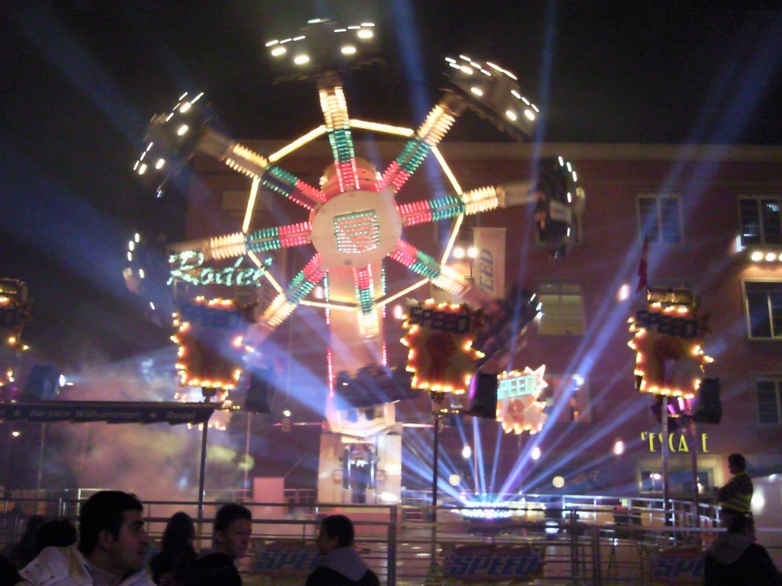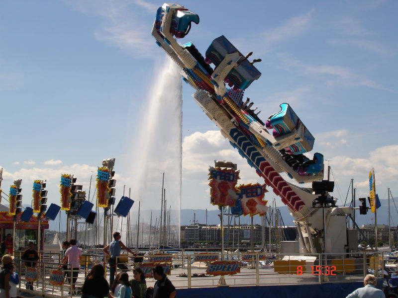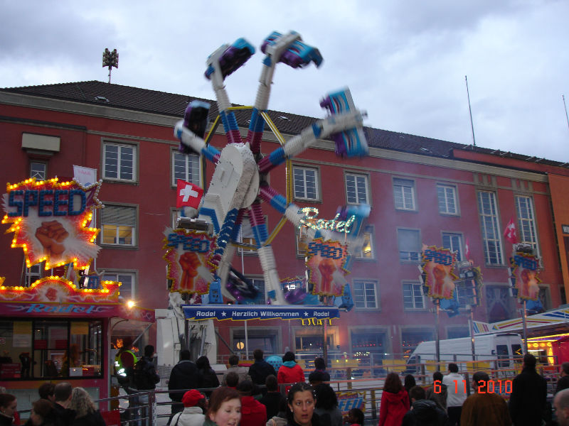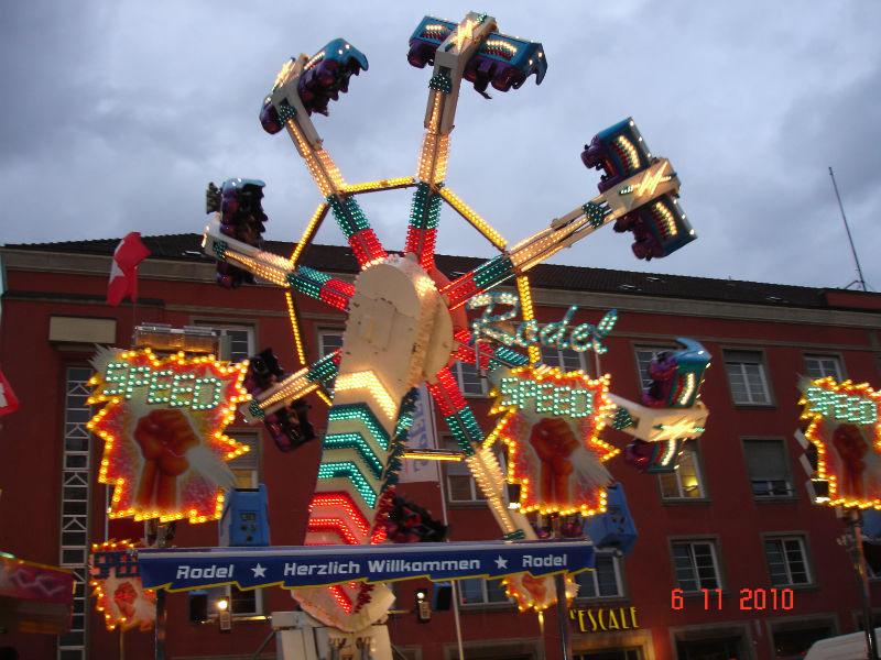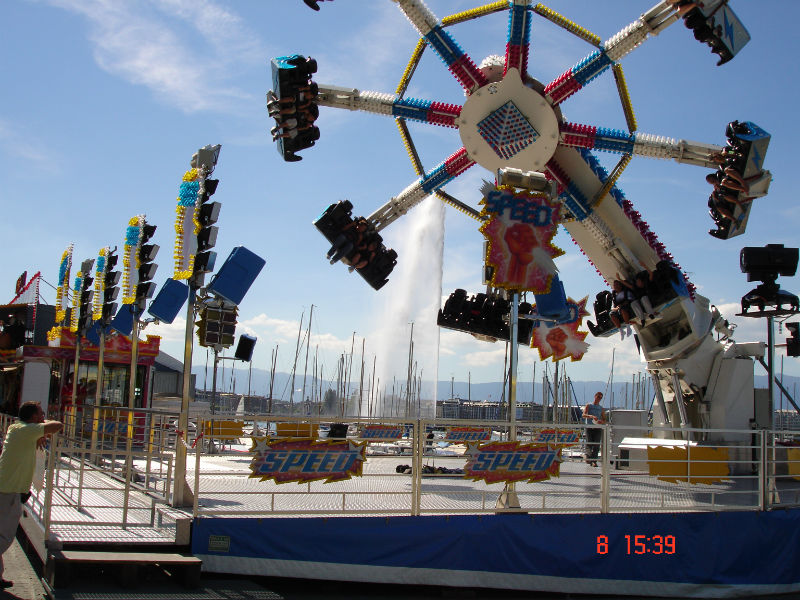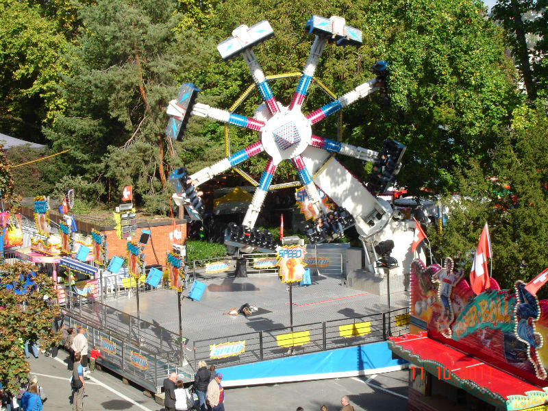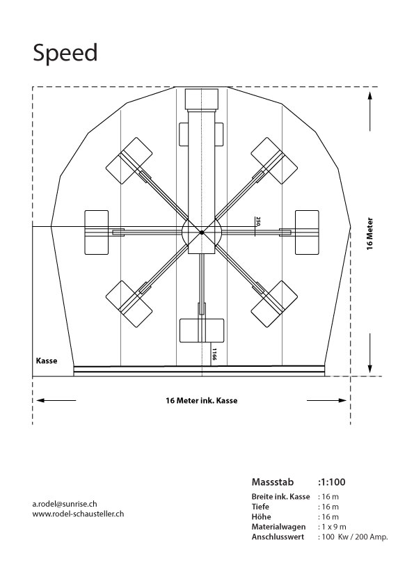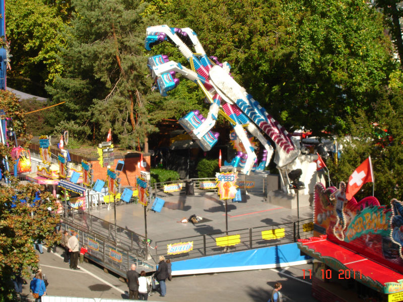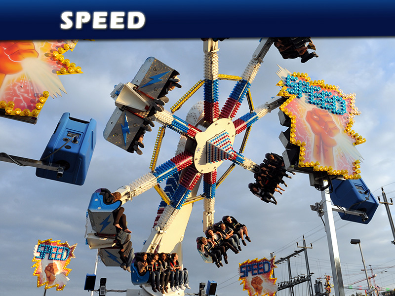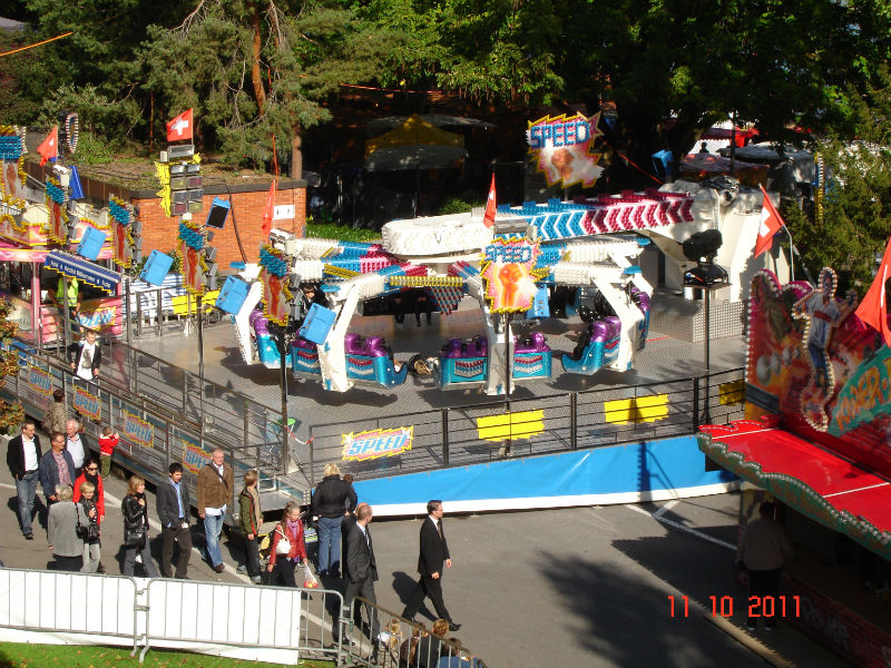 Das Überkopffahrgeschäft SPEED mit rasanter Fahrt. Durch die Neigung der Gondeln nach hinten bei steigendem Tempo ergiebt das ein angenehmes Fahrgefühl. Oben angekommen dreht sich das Rad über Kopf. Einen kurzen Zwischenhalt ist nicht ausgeschlossen, damit man die Aussicht geniessen kann. Maximale höhe ist bei 16 Meter.